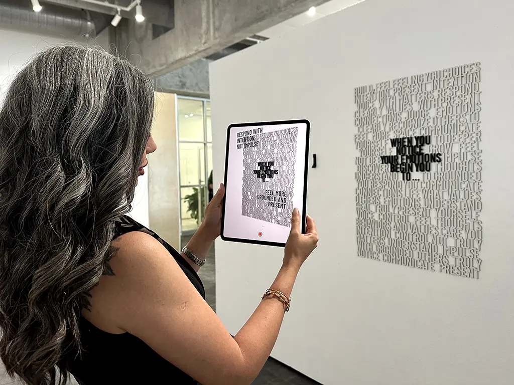 Using the Artivive app on a tablet or smartphone, viewers scan the piece to reveal an augmented reality layer. As the static letters begin to shift and move, select words from across the composition float forward and assemble into full sentences. These emerging phrases—such as “Respond with intention not impulse” or “Feel more grounded and present”—reflect the subtle yet profound shifts that emotional clarity can create in our lives and relationships.