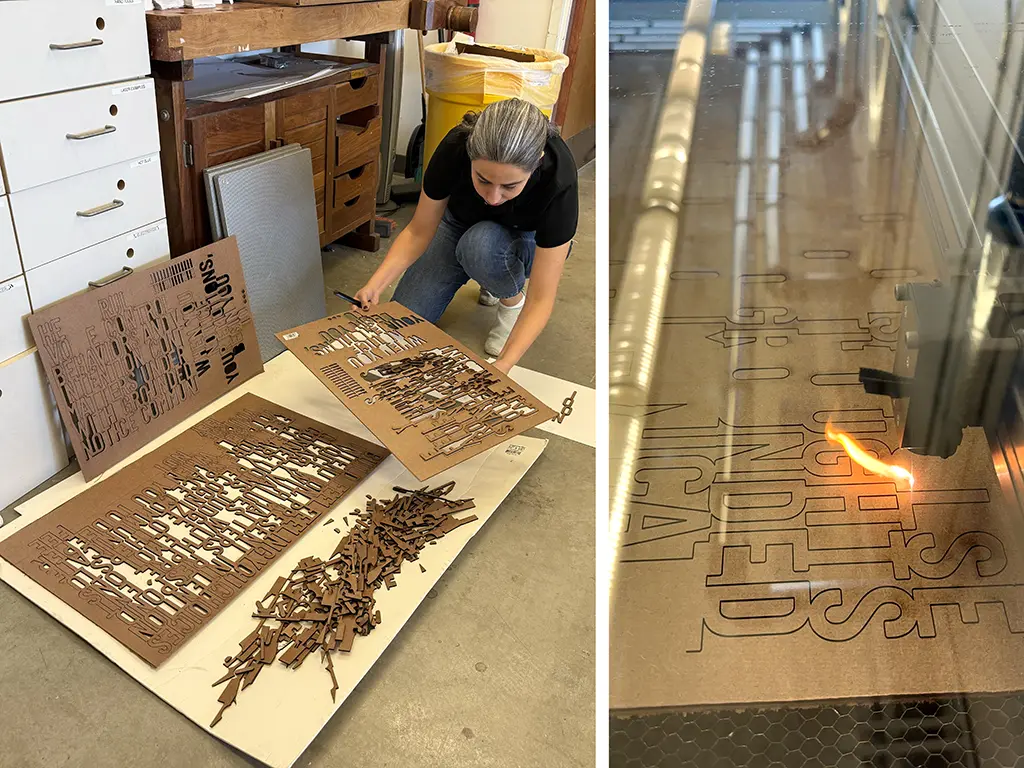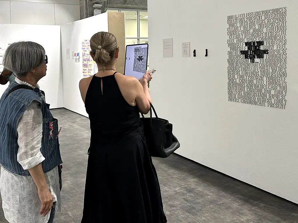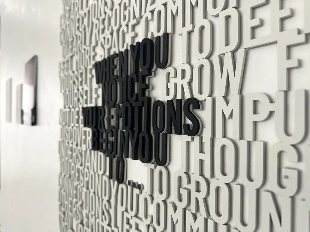 This interactive typographic installation invites visitors to consider the quiet power of emotional awareness. Crafted from laser-cut words joined into a single sculptural composition, the piece presents a dense field of language surrounding one open-ended prompt: